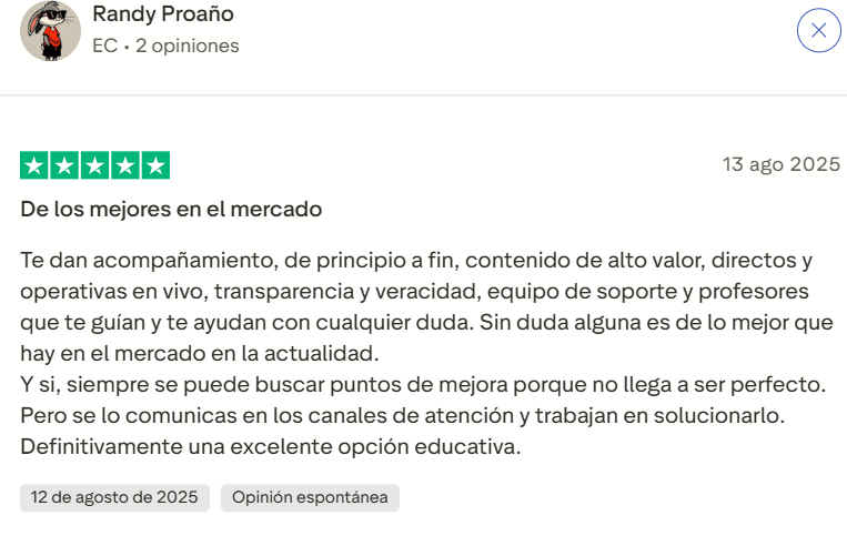 En conclusión, Élite del Trading cumple con lo que promete. No es una formación milagrosa, pero sí ofrece una ruta clara, asesoría constante, una estrategia validada y un acompañamiento efectivo. Si sientes que ha llegado el momento de generar un cambio significativo en tus finanzas, esta es la oportunidad que estabas esperando. Una inversión bien orientada puede cambiar tu visión del dinero, y para mí, Élite del Trading es una inversión valiosa.